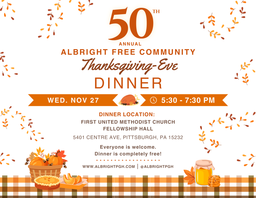The Albright Thanksgiving Eve Dinner is a free community event. All are welcome to attend and enjoy a hot, home-cooked meal.